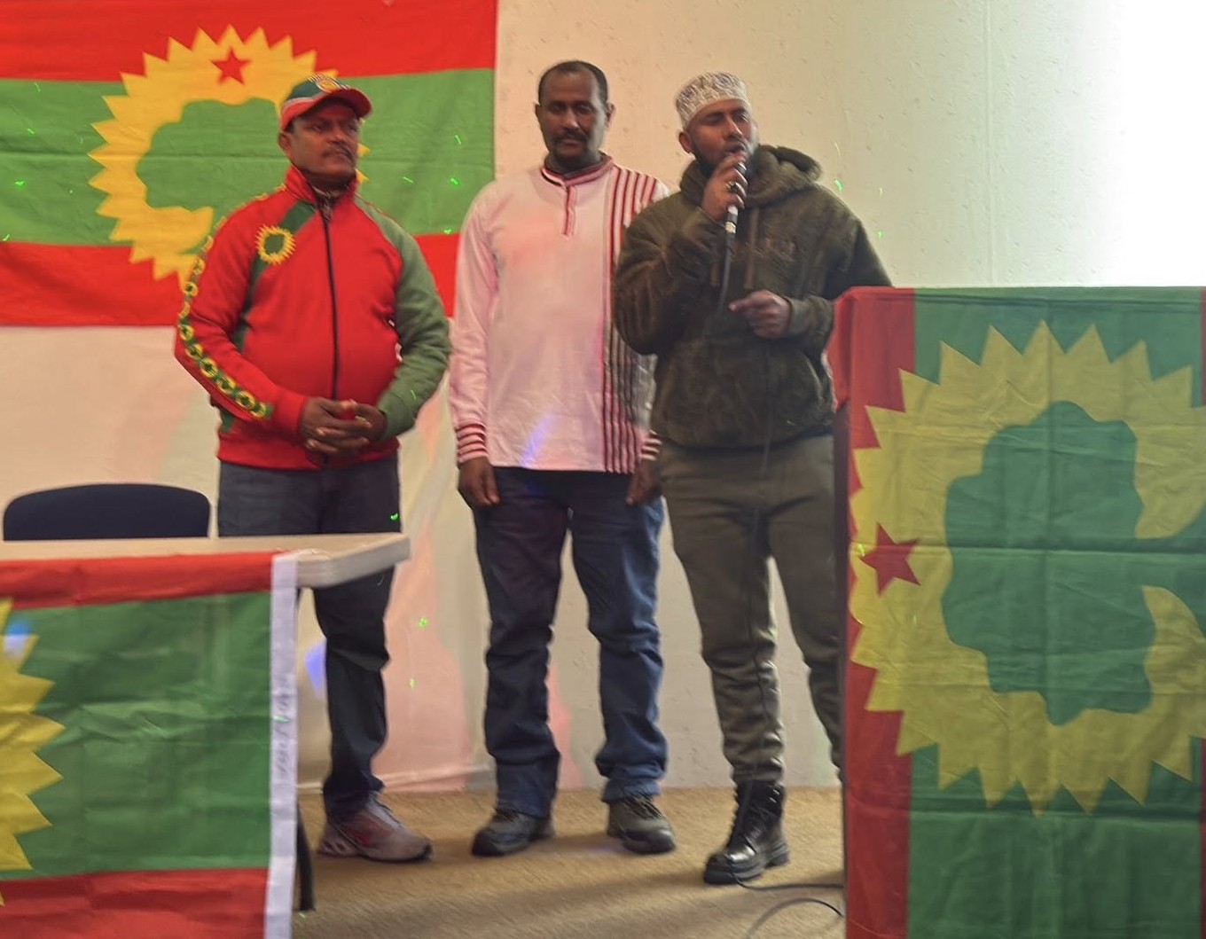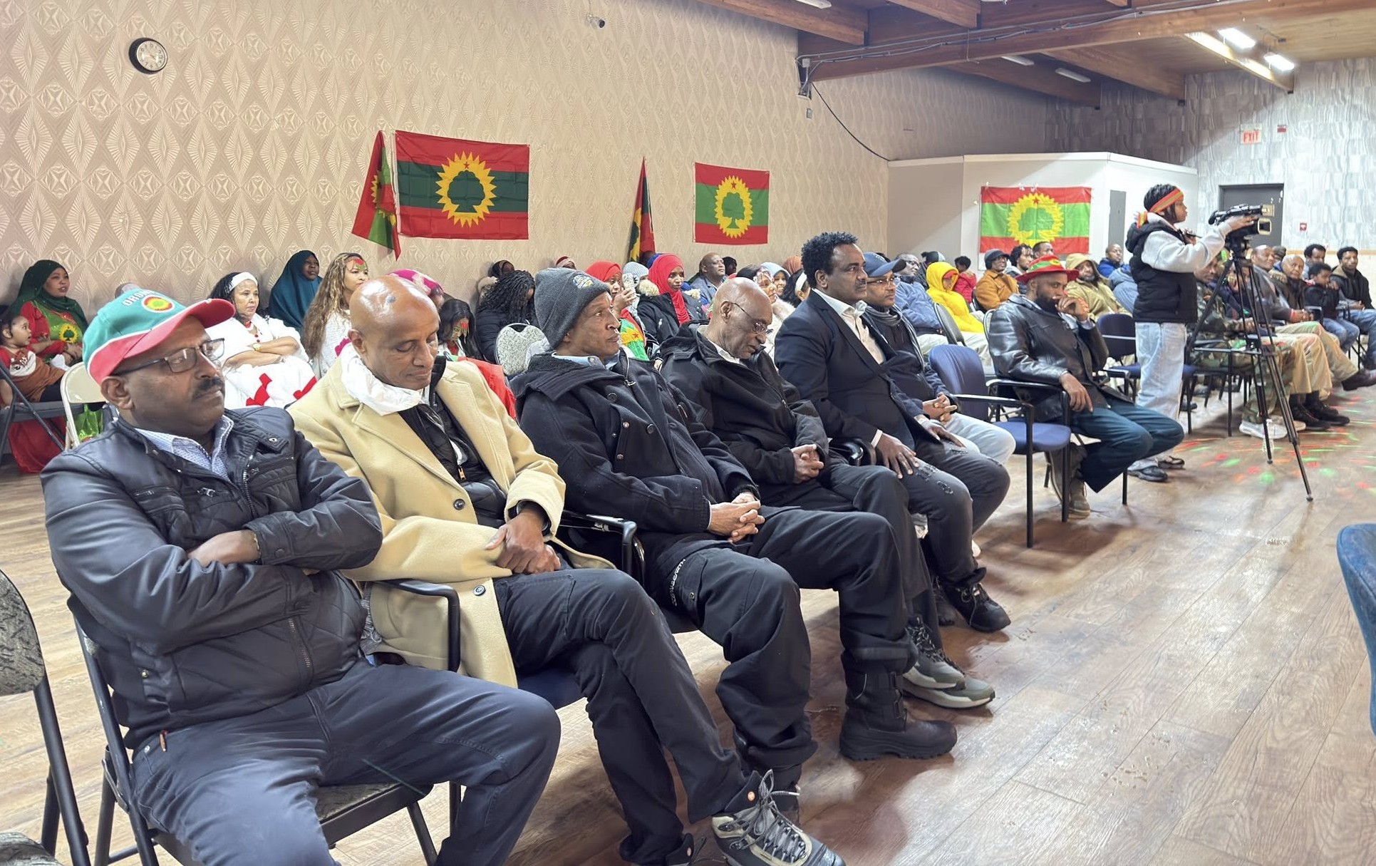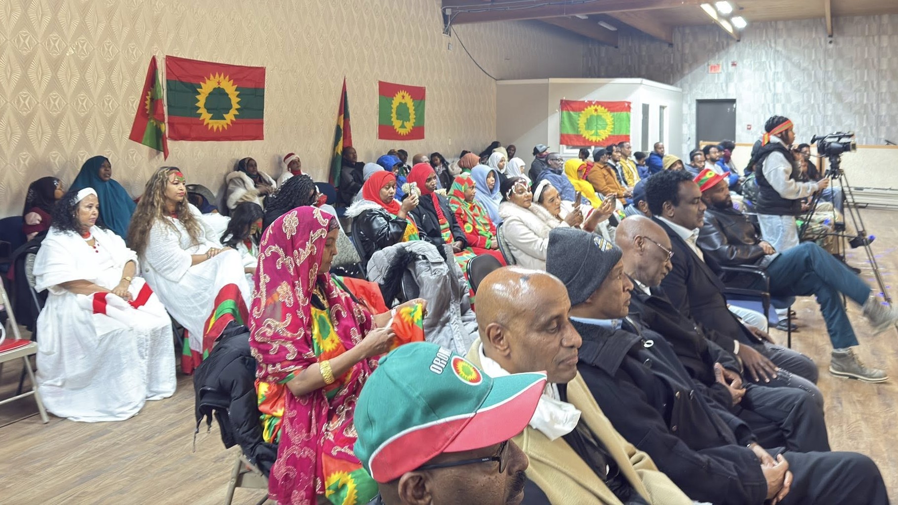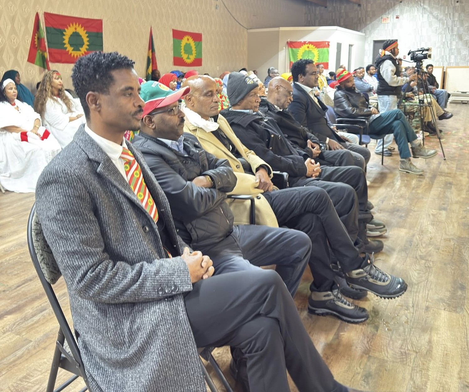 A photo of the gathered community, with a focus on Jaal Dhugaasaa Bakakkoo addressing the crowd or a group shot with the Oromo flag.