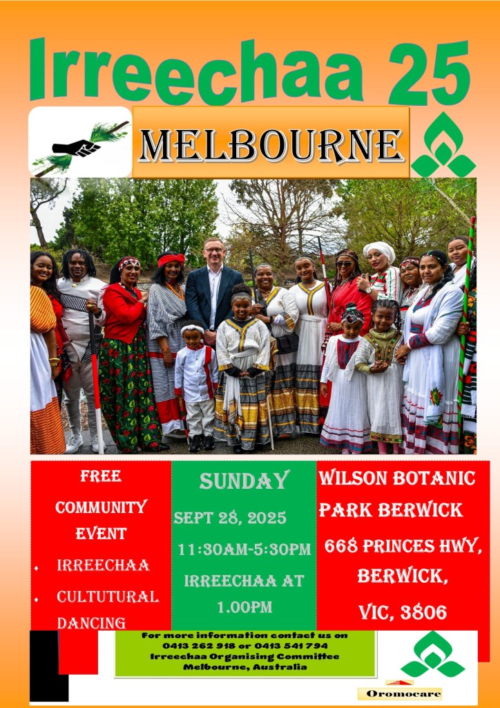 The Irreecha Oromo in Australia and its partners are delighted to invite you to be a part of our 2025 Thanksgiving Day (Irreechaa) festival on the 28th of September 2025 from 1:00-5:00 pm.